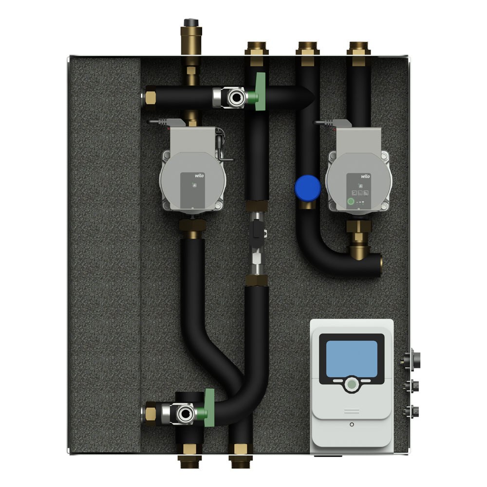 Включає температурні датчики, контролери, які автоматично керують роботою насосів та клапанів, підтримуючи задану температуру води.
